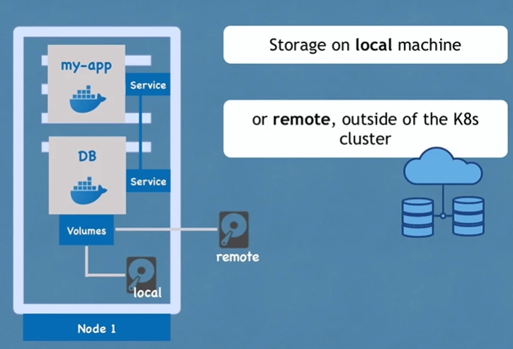 - Attaches physical storage to Pods (Like external hard drive)